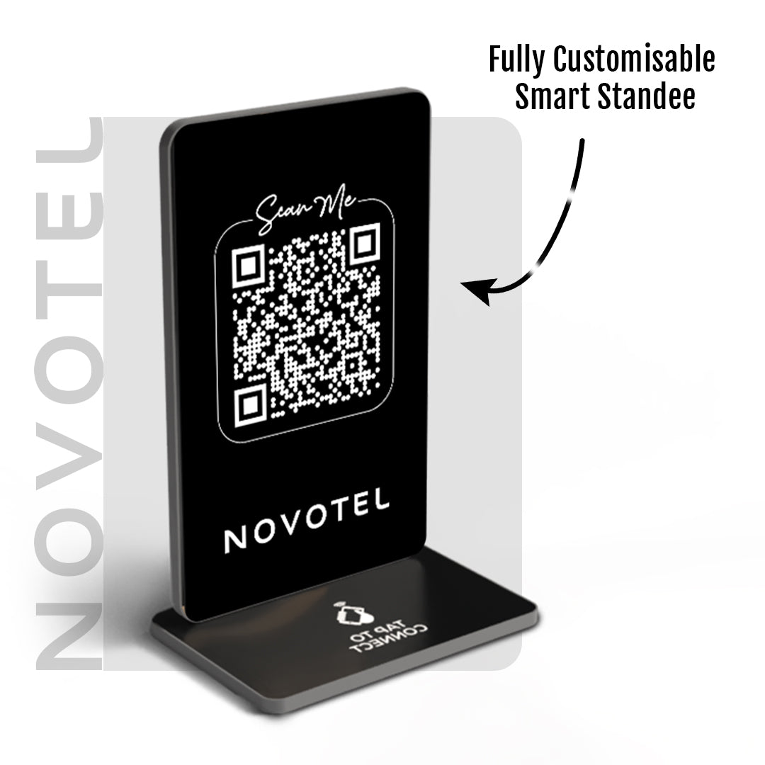 One smart standee replaces stacks of business cards.